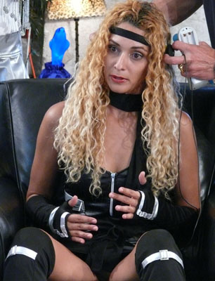 Mia snaps out of it again and I can tell she is not so sure about her power anymore but she is not quite ready to give up. For some reason, although reluctantly, she keeps calling me master which not only confuses her but also makes her feel a bit upset. Let's see whether she can handle the remote control in my hand. First I switch her to speaking Spanish without her being aware of it. Our Superheroin goes on and on about who knows what until I decide to mute her which does not stop her from moving her lips.